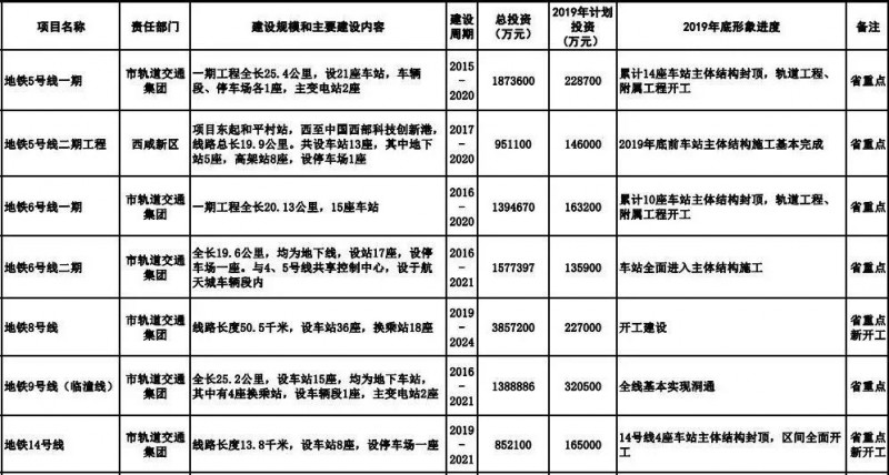 2019年底計劃完成進度:累計14座車站主體結構封頂,軌道工程、 附屬工程開工