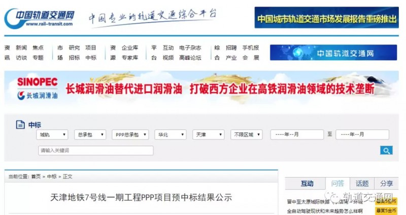 天津地鐵7號線一期工程PPP項目預(yù)中標(biāo)結(jié)果公示
