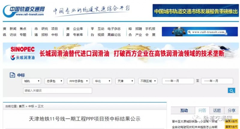 天津地鐵11號線一期工程PPP項目預(yù)中標(biāo)結(jié)果公示