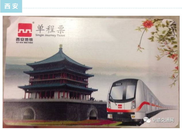 2015年西安地鐵投放了一批新的以“絲綢之路”為設計核心的單程票卡,票面正面黃白色相間,票面以大漠孤煙、絲綢之路群雕、大雁塔及西安地鐵車輛為表現元素,將地鐵這種現代化交通工具與古都西安絲綢之路歷史文明有機的結合在一起,文化內涵深邃。西安地鐵票價采用里程計價制,票價為起步價2元6(含6公理,以下類同)公里,每增加1元,可繼續乘坐4、4、6、6、8、8公里。即0-6公里2元;6-10公里3元;10-14公里4元;14-20公里5元;20-26公里6元;26公里以上每增加8公里增加1元。