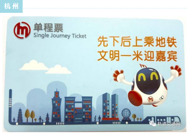 杭州地鐵單程票主要有兩個版本。“六和塔+錢江大橋”版整體采用綠色,突顯杭州旅游城市形象,綠色同時傳達便捷、暢通之意。 “城市剪影”版畫面主體為雷峰塔、市民中心、國際會議中心、寰球中心四大杭州地標的剪影,代表杭州由西湖時代到錢江時代的跨越。而貫穿起來的地鐵線路,則代表杭州地鐵網絡構建后給市民們帶來的便捷地鐵生活。杭州地鐵票制采用里程分段計價,1號線起步價為2元/人次,最高價為8元/人次。