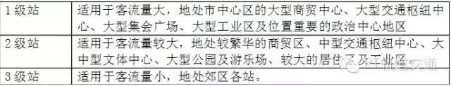 車站規模一般分為3個等級,在大城市中,車站規模按3個等級設置;在中等城市中,車站規模可以設2個等級。車站等級適用范圍,見表1