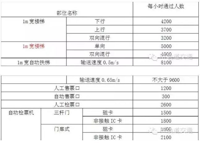 (5)各部位通過能力:車站各部位通過能力是確定該部位寬度尺寸及應設數量的依據。這些部位有通道、樓梯、自動扶梯、售、檢票口等。通過能力以單位時間內通過的人數來計算。