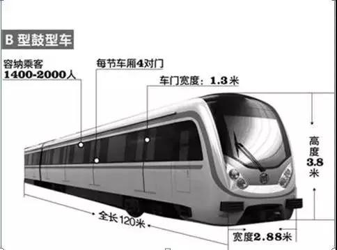標(biāo)準(zhǔn)B型車車寬2.8米,車體有效長度19.8米,多數(shù)為6節(jié)編組,少部分4節(jié)編組,軸重14t,單向小時最大客運量3-5.5萬。
