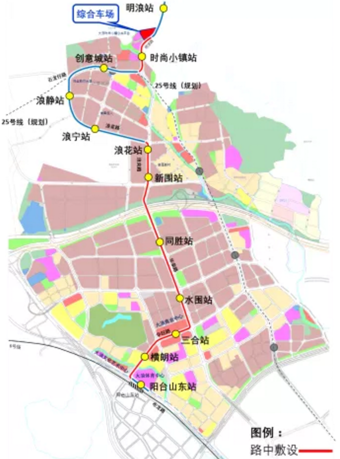 建設內容:龍華區小運量軌道交通大浪時尚小鎮線位于龍華區西部,線路起自6號線陽臺山東站,止于大浪綠道入口處,采用高架方式敷設和膠輪有軌電車制式,線路沿布龍路輔路-華旺路-華榮路-浪榮路-浪花路-石龍仔路-明浪路敷設,全長6.7公里,共設站12座,平均站間距約592米,明浪路西側設綜合車場1座。