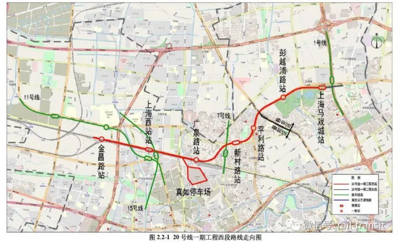 上海市軌道交通20號(hào)線(一期工程西段:金昌路站~上海馬戲城站區(qū)段)線路起于普陀金昌路站,終于上海馬戲城站,全線地下敷設(shè)方式,全長約7146米,設(shè)車站7座,停車場(chǎng)1座。