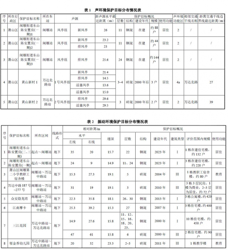 沿線主要分布有住宅、學校、行政辦公等環境保護目標,其中聲環境評價范圍內共有5處聲環境保護目標(見表1);振動環境評價范圍內共有19處振動環境保護目標(見表2);排風亭大氣評價范圍內有4處環境空氣環境保護目標(包含于聲環境保護目標);沿線不涉及自然保護區、風景名勝區、世界自然遺產地、生態保護紅線和基本農田。工程涉及杭州海塘,下穿建設控制地帶范圍180m;下穿蕭山越王遺址埋藏區397m;以隧道形式穿越錢塘江飲用水源準保護區3500m。