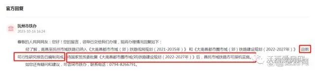 撫州市鐵辦進行了回復:經了解,南昌至撫州市域鐵路已納入《大南昌都市市域(郊)鐵路線網規劃(2021-2035年)》 和《大南昌都市圈市域(郊)鐵路建設規劃(2022-2027年)》,目前可行性研究報告已編制完成。待國家發改委批復《大南昌都市圈市域(郊)鐵路建設規劃(2022-2027年)》后,昌撫市域鐵路方可擇機實施。
