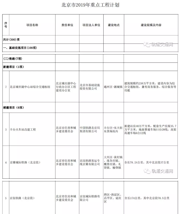 其中,在基礎設施方面,計劃完成投資約538億元。軌交領域將重點建設7項鐵路項目和21項城市軌道交通項目。北京市2019年重點工程計劃(軌交項目)如下: