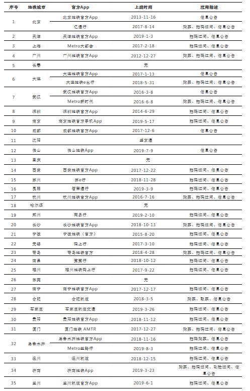 35個地鐵城市中,除長春、哈爾濱、重慶、東莞4個城市地鐵外,其余地鐵公司均已自建地鐵官方App。