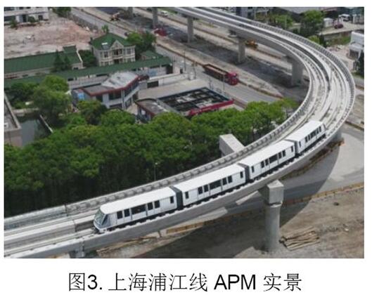 在國(guó)內(nèi),上海浦江線作為地鐵8號(hào)線的延伸線,選擇了全高架APM,線路全長(zhǎng)6.6km,遠(yuǎn)期高峰斷面預(yù)測(cè)1.41萬人/h, 2018年3月試運(yùn)營(yíng),見圖3。