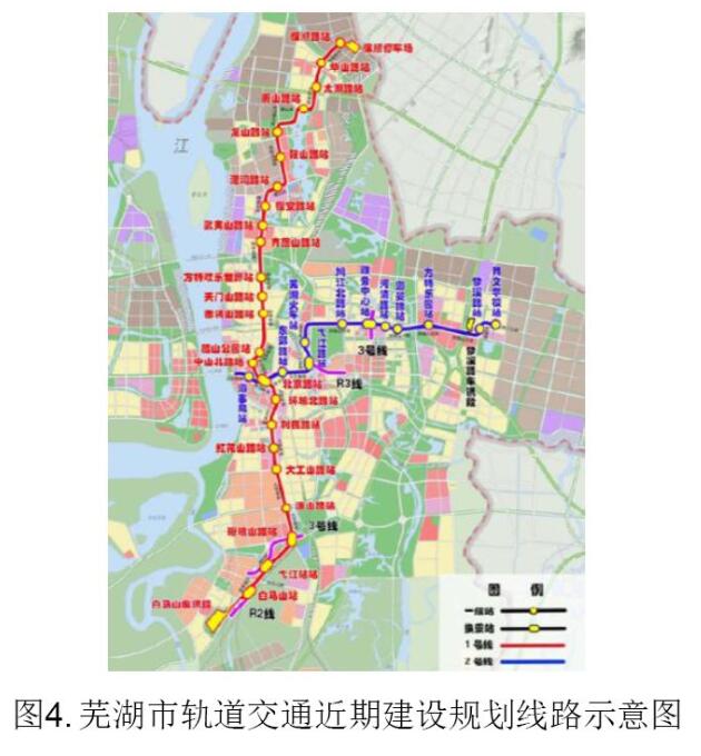蕪湖市軌道交通線網(wǎng)由5條市區(qū)線和4條市域線組成,共285km。國(guó)家發(fā)改委批復(fù)的近期建設(shè)規(guī)劃(見圖4)包括:1號(hào)線工程,30 公里,25 座高架站;2 號(hào)線一期工程,17 公里,10座高架和1座地下站,這兩條線組成了蕪湖市東西向、南北向骨干客流通道。采用PPP模式,由中車、中鐵聯(lián)合體負(fù)責(zé),2017 年6 月開工,計(jì)劃2020-2021年開通運(yùn)營(yíng)。