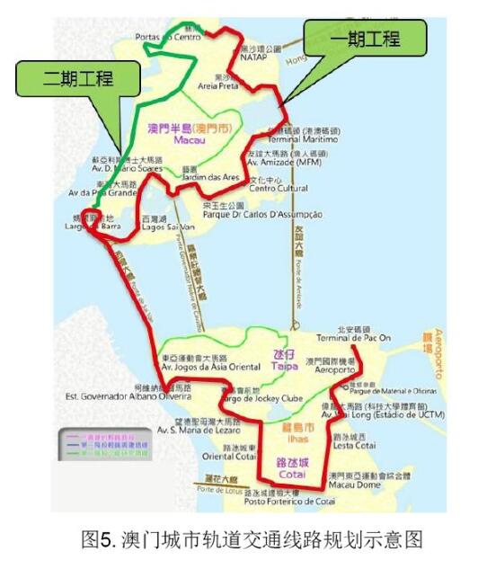 以澳門為例,陸地面積32.8km2,人口62萬,目前尚無運(yùn)營(yíng)的軌道交通。雖然澳門城市規(guī)模小,但人口密度高,且旅游出行人群特征顯著,預(yù)測(cè)軌道交通先建段初期高峰客流7800人,2020年1.41萬人,在城市道路交通資源受限的情況下,亟需建設(shè)立體的公共交通解決出行需求。澳門市區(qū)路窄彎多,地域狹窄,商業(yè)和居民區(qū)密集,工程條件制約多,需要選擇拆遷少、噪音低、造價(jià)合適的系統(tǒng),最終選擇了APM。根據(jù)規(guī)劃,其軌交網(wǎng)絡(luò)由2條線組成(見圖5),線路總長(zhǎng)25km,設(shè)30個(gè)車站,于2011年啟動(dòng)首期工程建設(shè)。