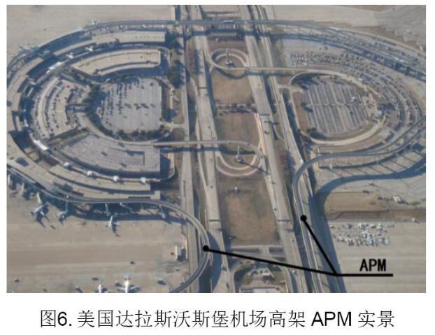 這些捷運(yùn)系統(tǒng)以APM制式為主,系統(tǒng)小巧,選線靈活,在工程條件上,更適合已建好的機(jī)場(chǎng);系統(tǒng)可靠性高,滿足24小時(shí)不間斷運(yùn)行,這與國(guó)際機(jī)場(chǎng)全天候運(yùn)行匹配;系統(tǒng)運(yùn)營(yíng)方案靈活,岔區(qū)緊湊,交路多,靈活編組,能更好地適應(yīng)晚點(diǎn)、集中到達(dá)等突發(fā)客流。圖6展示了達(dá)拉斯機(jī)場(chǎng)APM。
