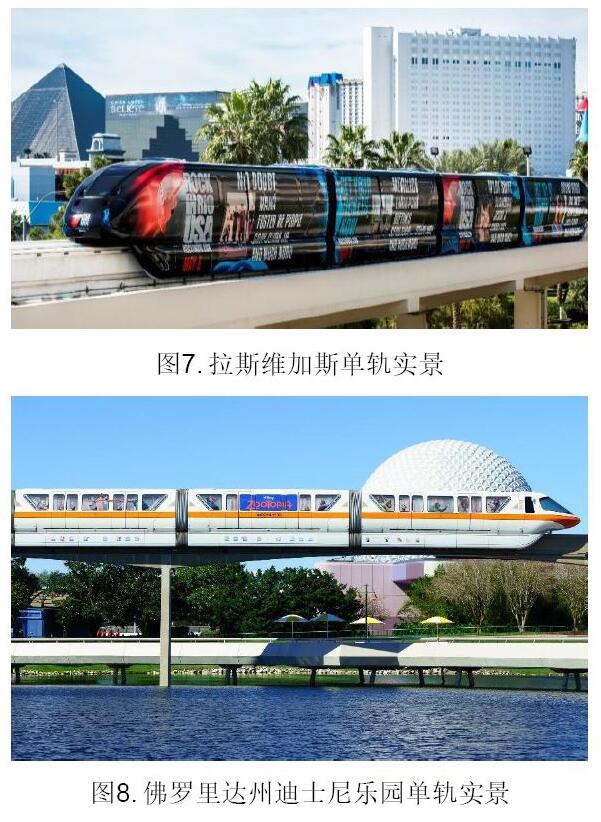 拉斯維加斯是世界著名的以賭博業(yè)為中心的旅游、購(gòu)物、度假城市,通過7個(gè)車站,6.3km單軌線路,串聯(lián)了城市中心:度假酒店、賭場(chǎng)、夜場(chǎng)、酒吧、體育場(chǎng),線路自1995年開通,年客運(yùn)量約400萬人次(見圖7)。此外,據(jù)不完全統(tǒng)計(jì),全球有30余個(gè)主題公園內(nèi)建設(shè)有跨座式單軌,作為園區(qū)內(nèi)部的交通方式(見圖8)。
