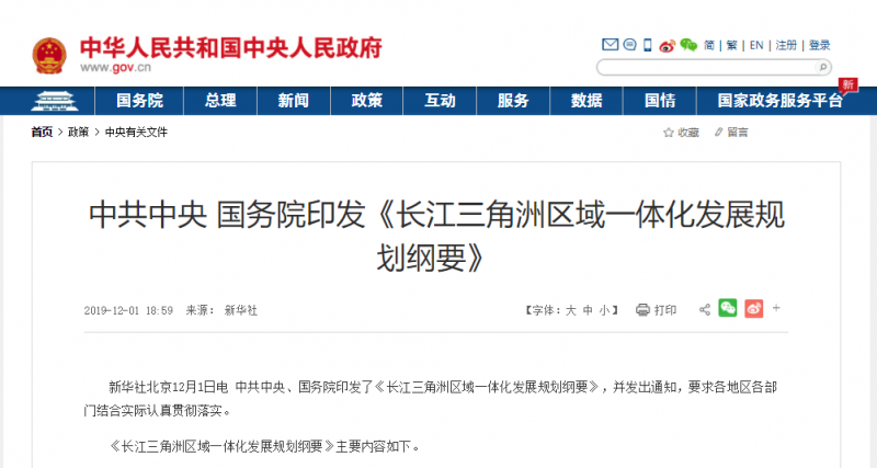 12月1日,中共中央、國務院印發了《長江三角洲區域一體化發展規劃綱要》。
