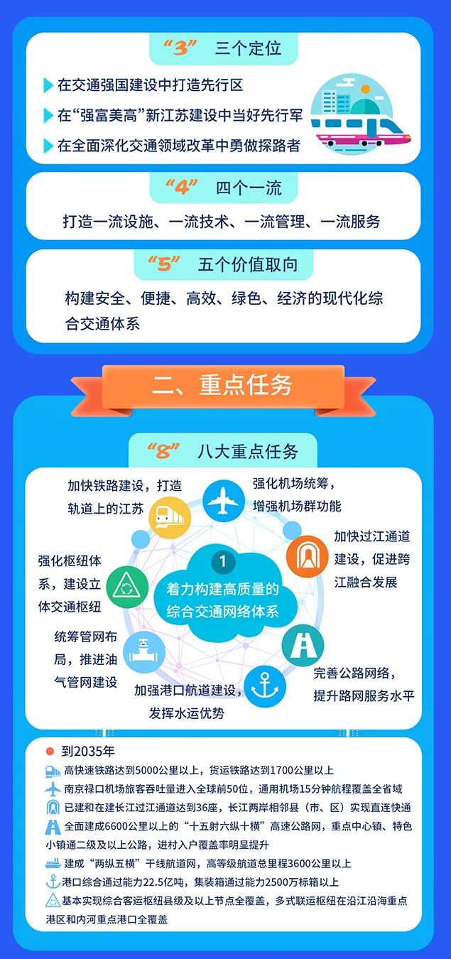 服務國家戰略和江蘇高質量發展要求,結合江蘇交通發展實際,努力打造“一帶一路”的交通標桿示范項目樣板,重點建設連霍新亞歐陸海聯運通道;打造長江經濟帶運輸結構調整樣板,重點發展公鐵水、海江河聯運;打造航運特色鮮明的大運河文化帶樣板,重點建設京杭大運河綠色航運示范區;打造綜合交通運輸改革發展樣板,重點構建統籌協同的規劃、建設、管理體制機制;打造樞紐經濟發展樣板,重點以優化重大樞紐布局推動產業發展;打造交通引領城市群發展樣板,重點建設沿江城市群多層次軌道網;打造交通服務鄉村振興樣板,重點建立“農村公路+”發展模式;打造創新驅動發展樣板,推動行業發展質量變革、效率變革、動力變革;打造平安交通發展樣板,重點實施科技興安工程;打造交通品質工程樣板,重點提升“十年路面百年橋”品牌優勢。