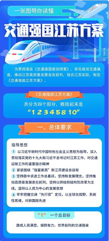 為貫徹落實《交通強國建設綱要》,率先建成交通強省,推動江蘇高質量發展走在前列,結合江蘇實際,制定《交通強國江蘇方案》。