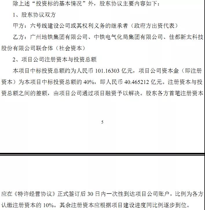 近期,廣州地鐵(聯合體牽頭人)、中鐵電氣化局(聯合體成員)與佳都科技(聯合體成員)組成的聯合體作為社會資本收到長沙軌道交通6號線項目中標通知書,中標投資總額約人民幣101.16303億元,根據長沙市人民政府的相關批復,采取政府與社會資本合作方式實施本項目,由政府方出資代表與中標社會資本按照約定股權比例成立項目公司,項目公司資本金為中標投資總額的40%。其中公司對項目公司的出資比例為15%。