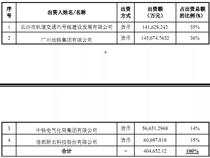 廣州地鐵集團、中鐵電氣化局集團、佳都科技擬與長沙市軌道交通六號線建設發展有限公司共同出資設立長沙穗城軌道交通有限公司(最終名稱以工商登記為準),項目公司注冊資本為40.465212億元人民幣。