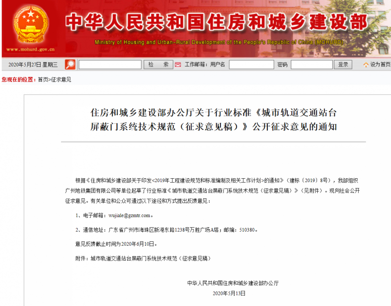 5月13日,住房和城鄉(xiāng)建設部辦公廳發(fā)布關(guān)于行業(yè)標準《城市軌道交通站臺屏蔽門系統(tǒng)技術(shù)規(guī)范(征求意見稿)》公開征求意見的通知。本規(guī)范主編單位:廣州地鐵集團有限公司,本規(guī)范適用于城市軌道交通工程新建、既有線加裝及更新改造屏蔽門系統(tǒng)的設計、安裝、驗收、保養(yǎng)與維護。