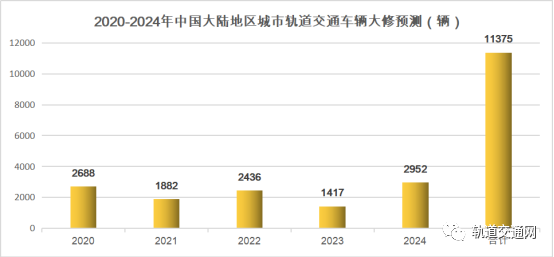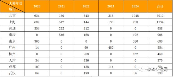表 2020-2024年中國大陸地區城市軌道交通車輛大修預測(前十)