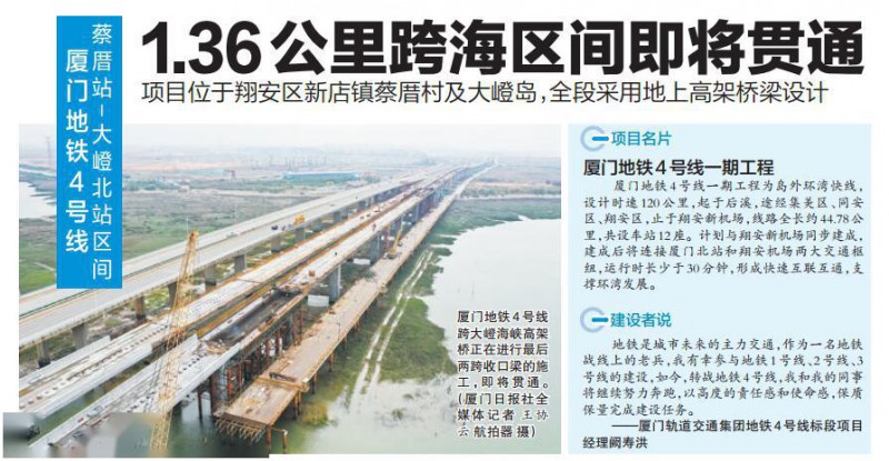 “等這兩跨收口梁澆筑完成后,全長1.36公里的高架橋梁區間將全部貫通。”站在跨海高架橋上,廈門軌道交通集團地鐵4號線標段項目經理闕壽洪告訴記者,目前,各參建單位正在合力攻堅,力爭在4月實現蔡厝站至大嶝北站區間貫通。