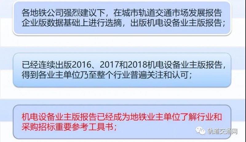 為更好的向業主單位服務,使其全面了解城市軌道交通機電設備市場現狀,今年,我們將繼續出版《2019城市軌道交通市場發展報告-機電設備篇》業主版(以下簡稱《2019業主版報告》)。