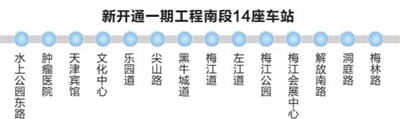 本次新開通的一期工程南段共14座車站,包括水上公園東路、腫瘤醫院、天津賓館、文化中心、樂園道、尖山路、黑牛城道、梅江道、左江道、梅江公園、梅江會展中心、解放南路、洞庭路、梅林路。市民乘坐6號線時,可在西站換乘1號線,在長虹公園站換乘2號線,在北站、紅旗南路站換乘3號線。