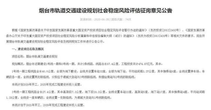 6月28日,煙臺市軌道交通集團有限公司發布了:煙臺市軌道交通建設規劃社會穩定風險評估征詢意見公告。