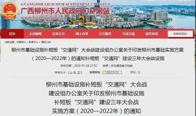 近日,柳州市人民政府門戶網站發布了《柳州市基礎設施補短板“交通網”建設三年大會戰實施方案(2020-2022年)》。