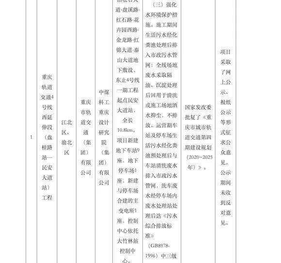 《重慶市生態(tài)環(huán)境局審查建設項目環(huán)評信息公示表20200917》對重慶軌道交通4號線西延伸段(盤桂路站—民安大道站)工程建設地點、建設單位、項目概況等方面進行了公示,其中在相關部門意見一欄中注明:國家發(fā)改委批復了《重慶市城市軌道交通第四期建設規(guī)劃(2020~2025年)》。