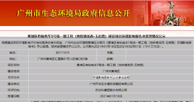 1月18日,廣州市生態(tài)環(huán)境局發(fā)布了黃埔區(qū)有軌電車5號線一期工程(地鐵鎮(zhèn)龍西-玉巖路)建設(shè)項目環(huán)境影響報告書受理情況公示。此次公示期為2021年1月18日至2021年2月1日,共10個工作日。