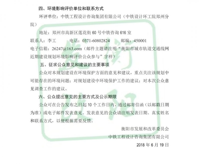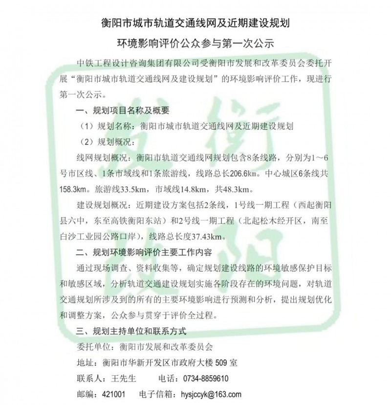 6月19日上午,衡陽市發改委官方公眾號發布了衡陽市城市軌道交通線網及近期建設規劃環境影響評價公眾參與第一次公示。