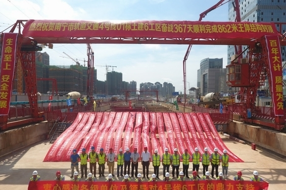 6月20日,隨著最后一方混凝土的澆筑,南寧軌道交通4號線最長深基坑——862m的飛龍路站至體育中心西站(兩站一區(qū)間)基坑主體結構順利封頂。至此,南寧軌道交通4號線19個車站已封頂12個。
