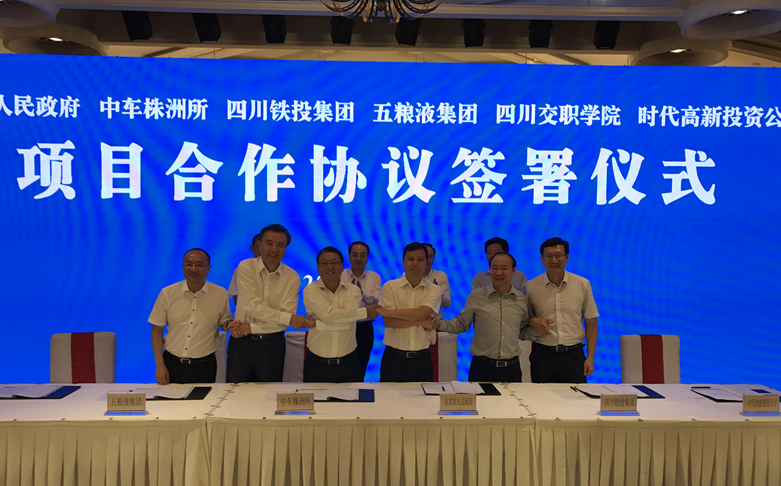 6月27日,四川中車鐵投軌道交通產業項目簽約儀式在成都舉行。該協議由四川省宜賓市人民政府、中車株洲電力機車研究所有限公司、四川省鐵路產業投資集團有限責任公司、宜賓五糧液集團有限公司、四川交通職業技術學院、株洲中車時代高新投資有限公司共同簽署。根據協議,6方將在宜賓共同建設智能軌道交通快運系統大西南產業基地。