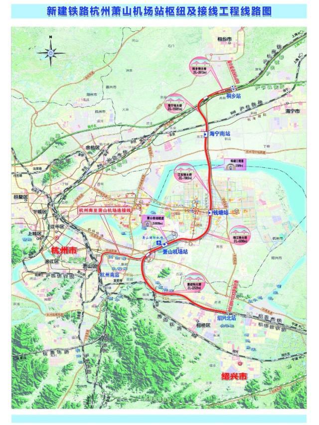 規劃中的杭州機場高鐵全長約85公里,途經嘉興桐鄉市、海寧市,杭州錢塘區、蕭山區及紹興柯橋區,其中正線長約72公里,蕭山機場至杭州南站聯絡線長約13公里。全線新設海寧南站、錢塘站、蕭山機場站,改擴建桐鄉站,接入紹興北站,投資總額約382億元。