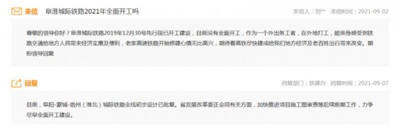 安徽省發改委回復:目前,阜陽-蒙城-宿州(淮北)城際鐵路全線初步設計已批復。省發展改革委正會同有關方面,加快推進項目施工圖審查等后續前期工作,力爭盡早全面開工建設。
