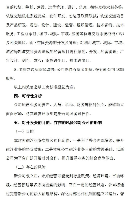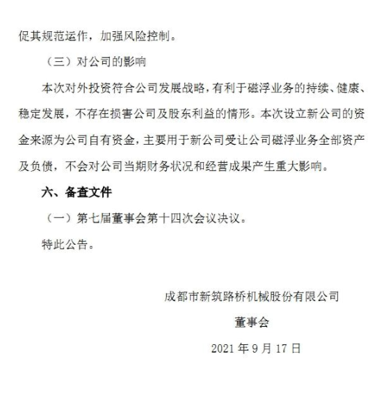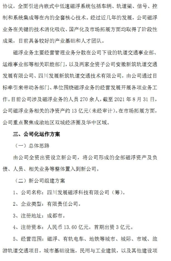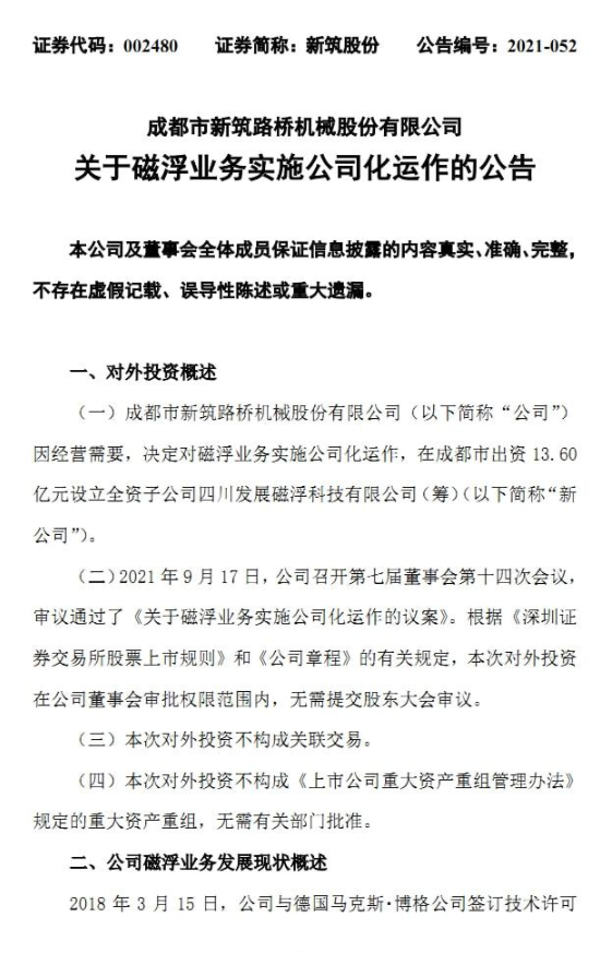 新筑股份9月17日公告稱,對(duì)磁浮業(yè)務(wù)實(shí)施公司化運(yùn)作,在成都市出資13.6億元設(shè)立全資子公司四川發(fā)展磁浮科技有限公司(籌);對(duì)工程構(gòu)件業(yè)務(wù)實(shí)施公司化運(yùn)作,以公司全資子公司新筑交通為實(shí)施平臺(tái),公司以貨幣、實(shí)物等方式向其增資3.5億元。