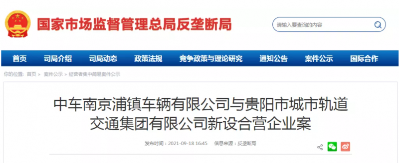 據反壟斷局18日公示的經營者集中簡易案信息顯示:中車南京浦鎮擬與貴陽地鐵新設合營企業。