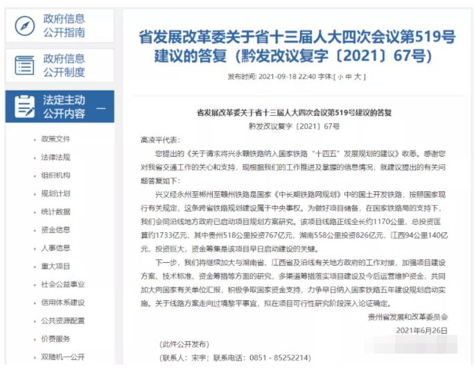 9月18日,貴州省發(fā)展改革委公開(kāi)了《關(guān)于省十三屆人大四次會(huì)議第519號(hào)建議的答復(fù)》(黔發(fā)改議復(fù)字〔2021〕67號(hào)),針對(duì)《關(guān)于請(qǐng)求將興永贛鐵路納入國(guó)家鐵路“十四五”發(fā)展規(guī)劃的建議》進(jìn)行了答復(fù):
