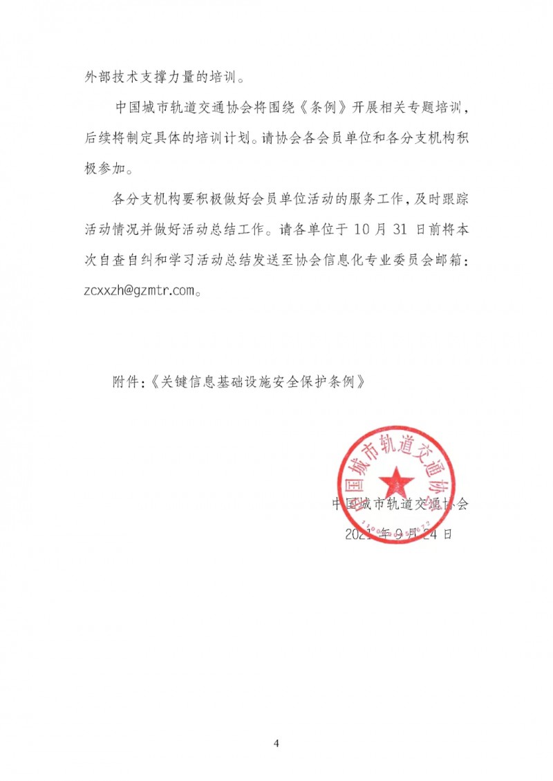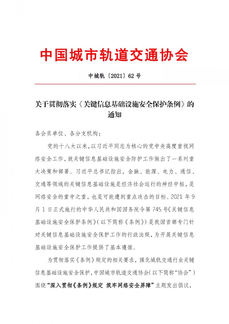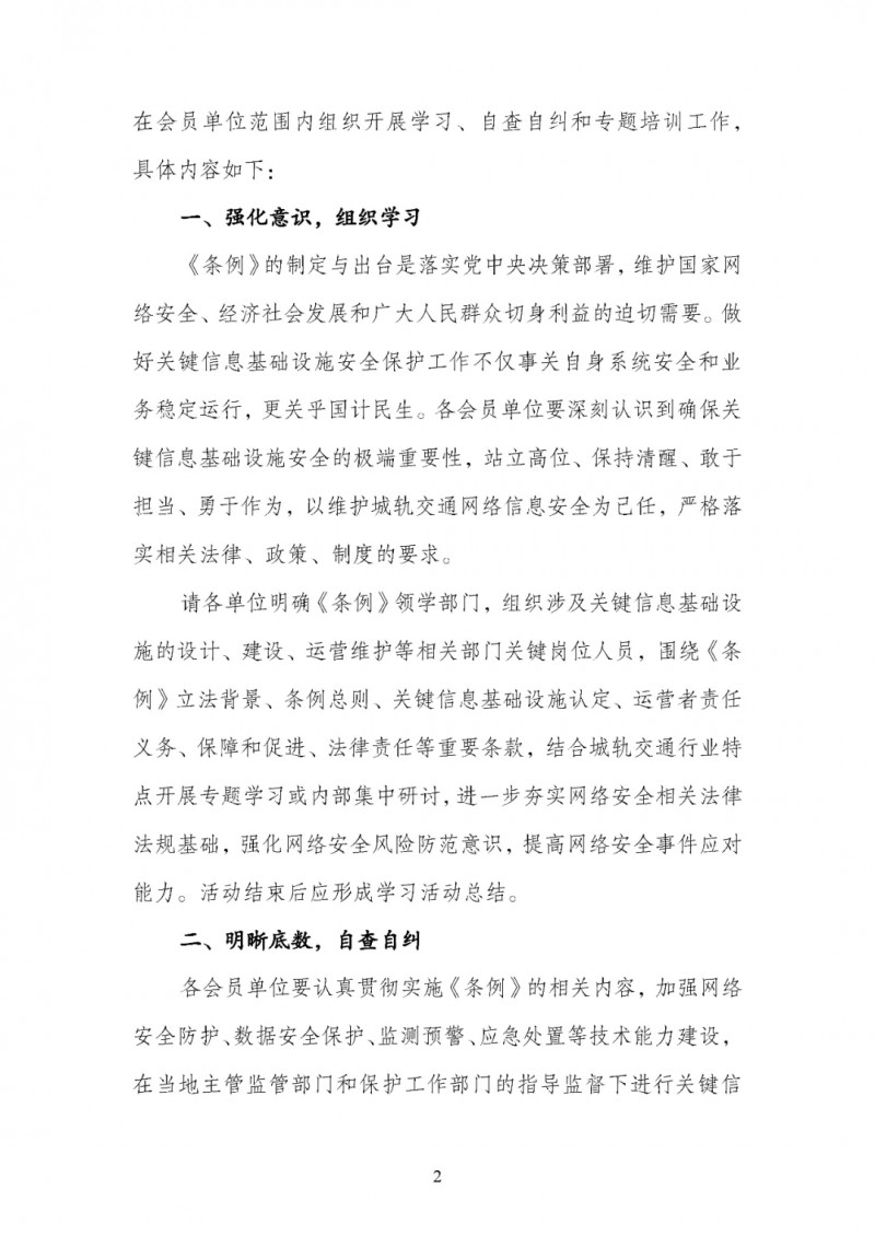 為貫徹落實《條例》規定的相關要求,強化城軌交通行業關鍵信息基礎設施安全保護,城市軌道交通協會(以下簡稱“協會”)圍繞“深入貫徹《條例》規定 筑牢網絡安全屏障”主題發出倡議,在會員單位范圍內組織開展學習、自查自糾和專題培訓工作,具體內容如下: