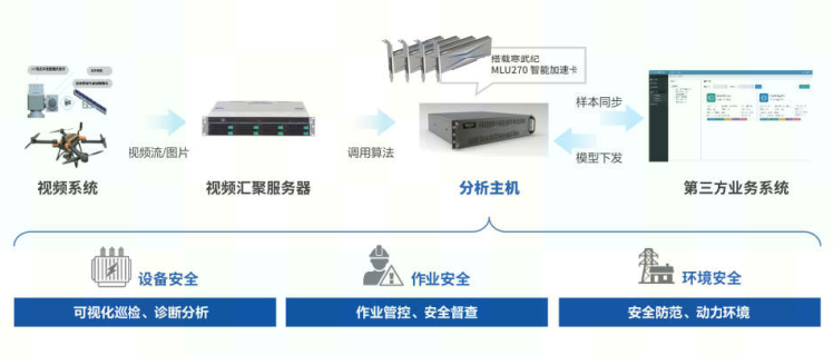 作為智慧運維場景中關鍵應用之一,無人值守牽引變電站解決方案圍繞“自動巡視、智能預警、智能決策”,實現變電站運行信息和設備狀態監測信息等運檢全業務數據整合,支持儀表參數識別、油污檢測、絕緣老化、異常發熱、開關狀態識別等,有效提升運檢工作質量和效率。寒武紀聯合軟硬件合作伙伴共同為客戶提供“交鑰匙式”服務,助力定制化解決方案的快速上市。