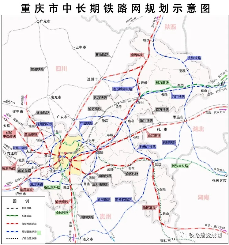在國家《中長期鐵路網規劃》規劃的“八縱八橫”高速鐵路主通道中,京昆、包(銀)海、蘭(西)廣3縱主通道和沿江、廈渝2橫主通道在重慶交匯。國家通道涉及的渝鄭高鐵、渝昆高鐵、渝西高鐵、渝貴高鐵、成渝高鐵、渝湘高鐵、成渝中線等已列入國家鐵路網中長期規劃,再加上重慶市規劃的成蘭渝高鐵、渝桂高鐵等,總體上形成對外 8 個方向的“米”字型高鐵網。
