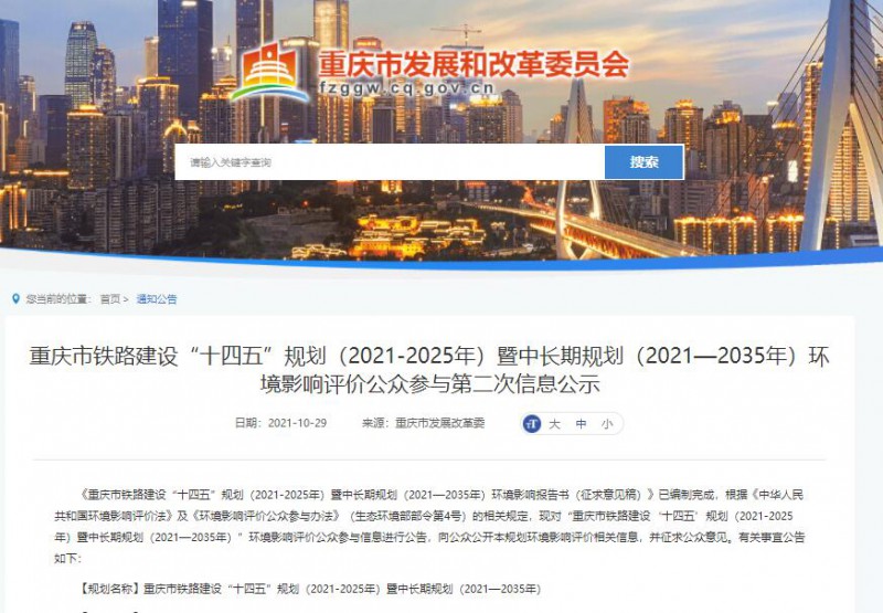 《重慶市鐵路建設“十四五”規劃(2021-2025年)暨中長期規劃(2021—2035年)環境影響報告書(征求意見稿)》已編制完成,根據《中華人民共和國環境影響評價法》及《環境影響評價公眾參與辦法》(生態環境部部令第4號)的相關規定,現對“重慶市鐵路建設‘十四五’規劃(2021-2025年)暨中長期規劃(2021—2035年)”環境影響評價公眾參與信息進行公告,向公眾公開本規劃環境影響評價相關信息,并征求公眾意見。