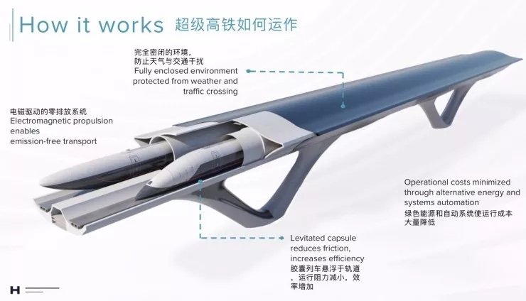 Hyperloop 是一個高速地面運輸系統,以前所未有的速度載人載物。膠囊型車廂懸浮于低壓管道,將乘客與貨物運送不同城市。管道內氣壓大幅度降低,HyperloopTT 專有的被動式懸浮與線性感應電機技術使膠囊車廂以近乎無摩擦力的情況下高速行駛。