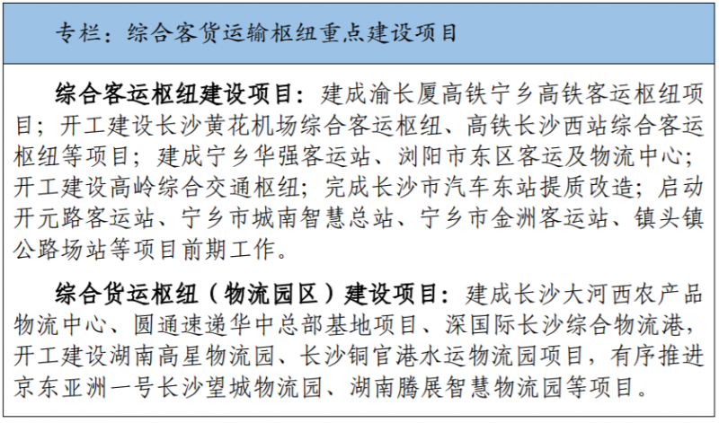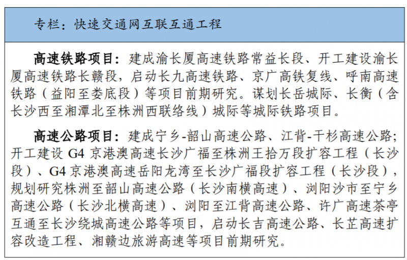 “十四五”期,重點推進渝長廈高速鐵路常益長段、渝長廈高速鐵路長贛段等高速鐵路建設項目,建設里程約153公里,總投資約305億元;重點推進寧鄉-韶山高速公路、江背-干杉高速公路、G4京港澳高速長沙廣福至株洲王拾萬段擴容工程(長沙段)、G4京港澳高速岳陽龍灣至長沙廣福段擴容工程(長沙段)等項目建設,總投資約187億元。
