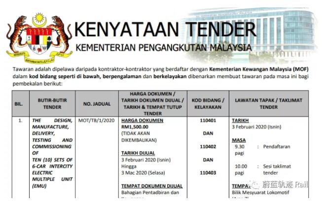 2020年1月,馬來(lái)亞鐵道公司發(fā)布招標(biāo)信息,將采購(gòu)10列全新列車(chē)。