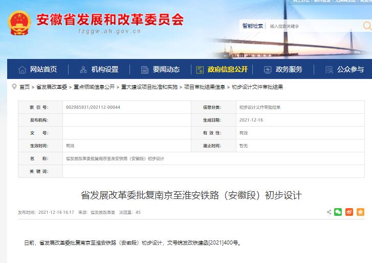 安徽省發改委消息:日前,安徽省發展和改革委員會批復南京至淮安鐵路(安徽段)初步設計,批復文號為皖發改鐵建函[2021]400號。寧淮鐵路安徽段初步設計的批復,標志著此項目建設邁出重要一步。