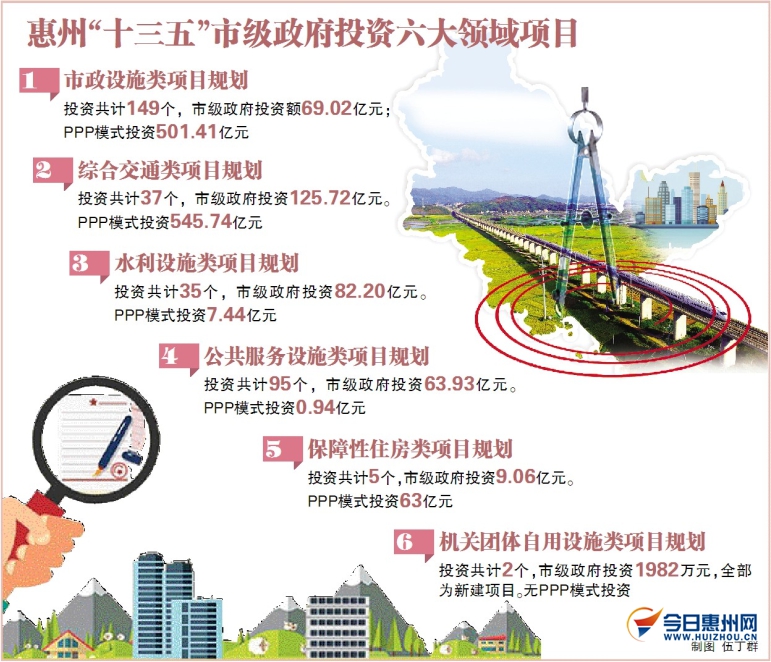 近日,惠州市發展和改革局官網公示《惠州市級政府投資建設項目“十三五”規劃(2016~2020年)》(下稱《規劃》)?!笆濉逼陂g,惠州市級政府投資建設規劃項目有323個,總投資估算2275億元,市級財政投資350億元。